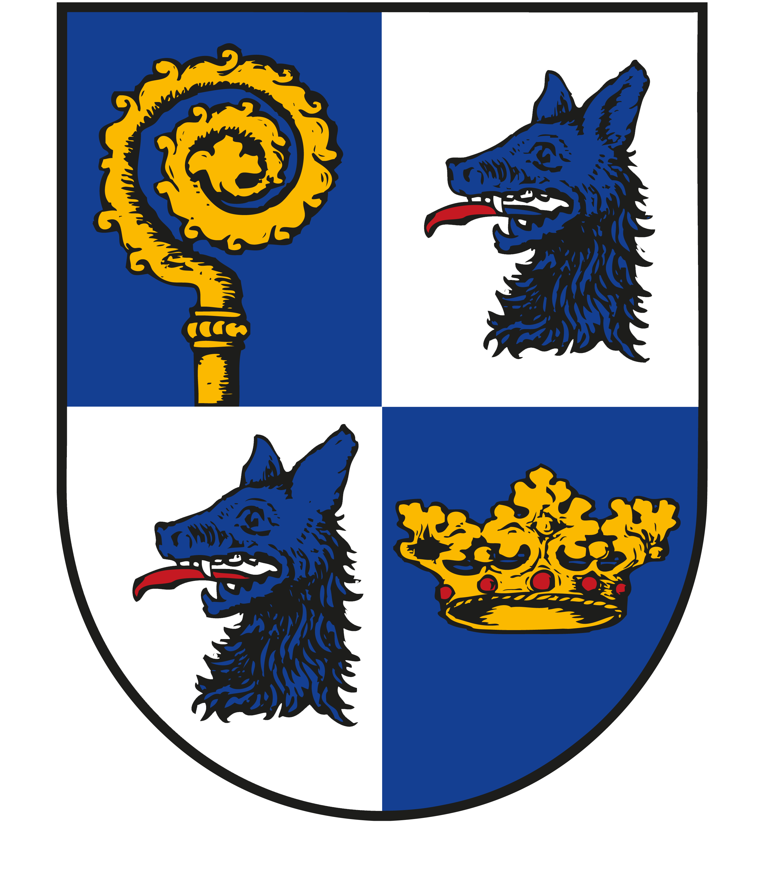 Die heraldische Beschreibung des Wappens lautet: “In von Blau und Silber geviertem Schild in Feld 1 der goldene obere Teil eines Bischofstabes, in 4 eine goldene Krone; in den silbernen Feldern 2 und 3 ein blauer, rot bezungter Wolfskopf.”